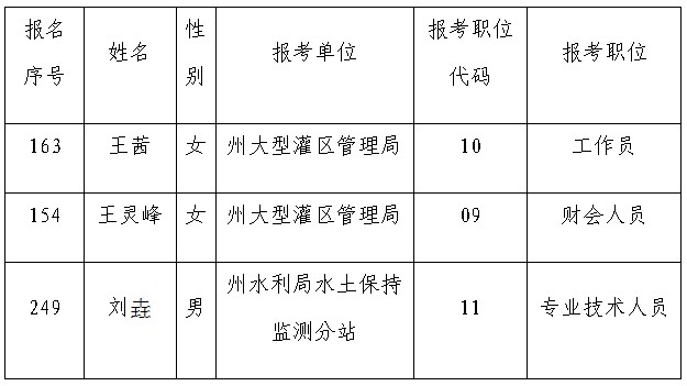 根據(jù)《2010年黔西南州直事業(yè)單位、州工業(yè)投資有限責(zé)任公司新增人員公開招考簡章》的規(guī)定,王茜等3名考生經(jīng)筆試、面試、體檢、考察合格,確定為擬聘用人員,現(xiàn)予以公示,公示期七天(2011年2月9日-2月15日),公示期間如有疑問,請聯(lián)系黔西南州人力資源和社會保障局事業(yè)單位人事管理科,電話:0859-3221609。擬聘用人員名單如下: