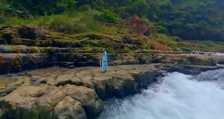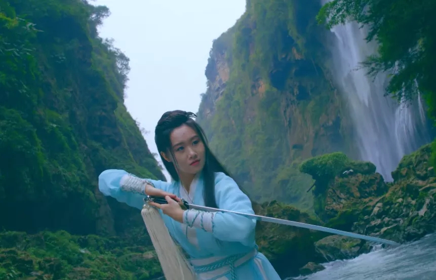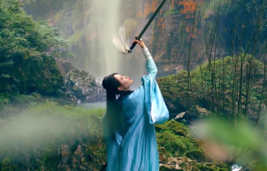 在群瀑飛流、翠竹倒掛、溶洞相連間舞劍,輕步曼舞如燕子伏巢、疾飛高翔似鵲鳥夜驚,美麗的舞姿閑婉柔靡,機敏的迅飛體輕若風,搭配成一幅幅絕美的畫卷。