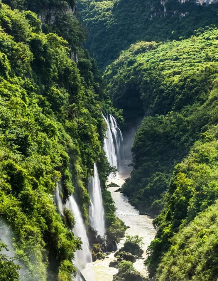 馬嶺河峽谷風景名勝區(qū)位于興義市城東北四公里處,以“天溝地縫百瀑谷”之名享譽世界。站在谷底向天空望去,云貴高原巖溶地貌的典型特征展露無遺:既有峰叢、石林、瀑布群,又有翠竹倒掛,溶洞相連,一步一景,真可謂“造化鐘神秀”!幾十條瀑布墜落峽谷,激越的如龍吟虎嘯,萬馬奔騰;婉約的似風擺柳條,魚戲蓮田。