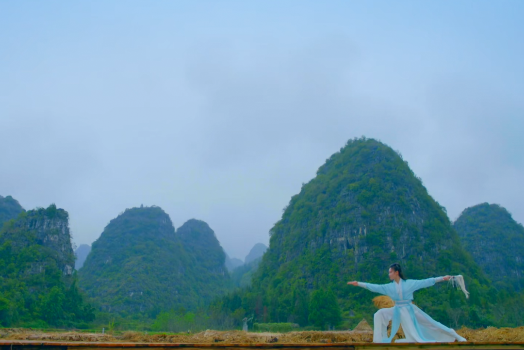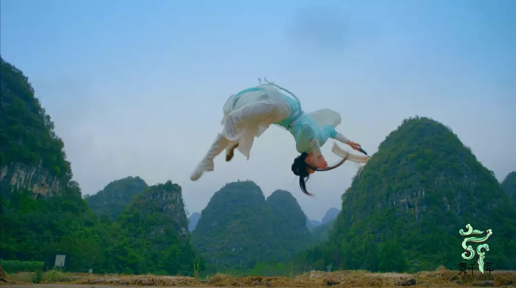 在《舞千年》第三章婉平爭舞獻明堂《越女凌風》這期節(jié)目中,拍攝地位于貴州省黔西南州興義市,把馬嶺河峽谷和萬峰林作為舞蹈背景,在山水中舞劍,把峽谷激流的澎湃與俠風剛?cè)岵奈璧赶嘟Y(jié)合,以景襯情,表演者充分演繹了“以劍作舞紅傘為約,俠心傲渺勝似云”。