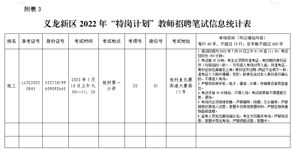 義龍新區(qū)教育局對(duì)資格審查合格人員名單進(jìn)行匯總審核,并對(duì)其參加筆試考試的準(zhǔn)考證信息進(jìn)行編排后填寫(xiě)《義龍新區(qū)2022年特崗教師招聘筆試信息統(tǒng)計(jì)表》(附表2),連同考務(wù)工作安排于2022年7月9日下午6點(diǎn)前以電子郵件形式報(bào)州教育局。